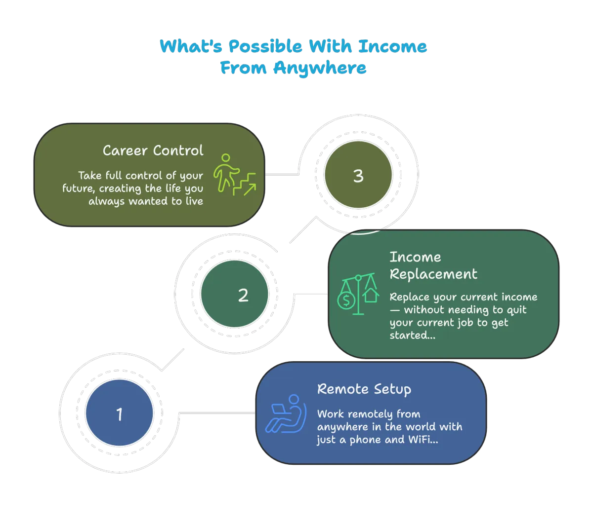 Income From anywhere is for people who want to live life on their own terms by working 100% remotely online and who want to do it part time or full time without having the stress of building a business.